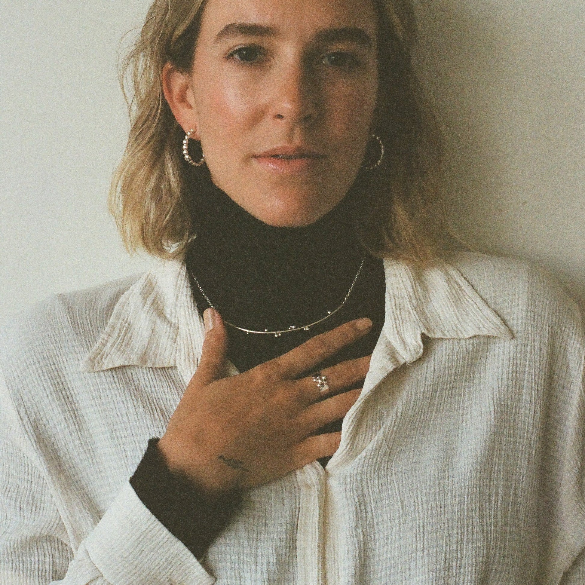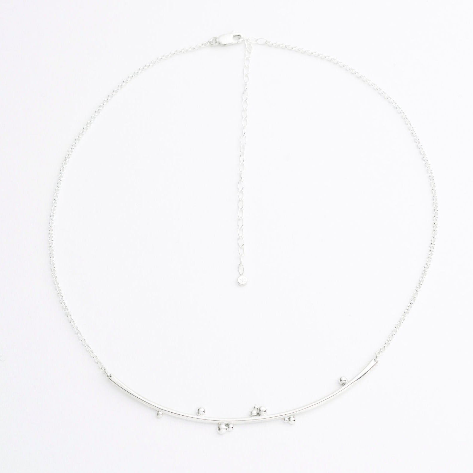 The Colombe necklace combines elegant design with a responsible approach. Its central half-moon-shaped element is decorated with granules recovered from excess manufacturing, demonstrating artisanal know-how and attention to the environment. Made of sterling silver, this semi-rigid jewel rests delicately on the neckline and is accompanied by a rolo-type chain with an adjustable extension allowing for comfortable and versatile wear.