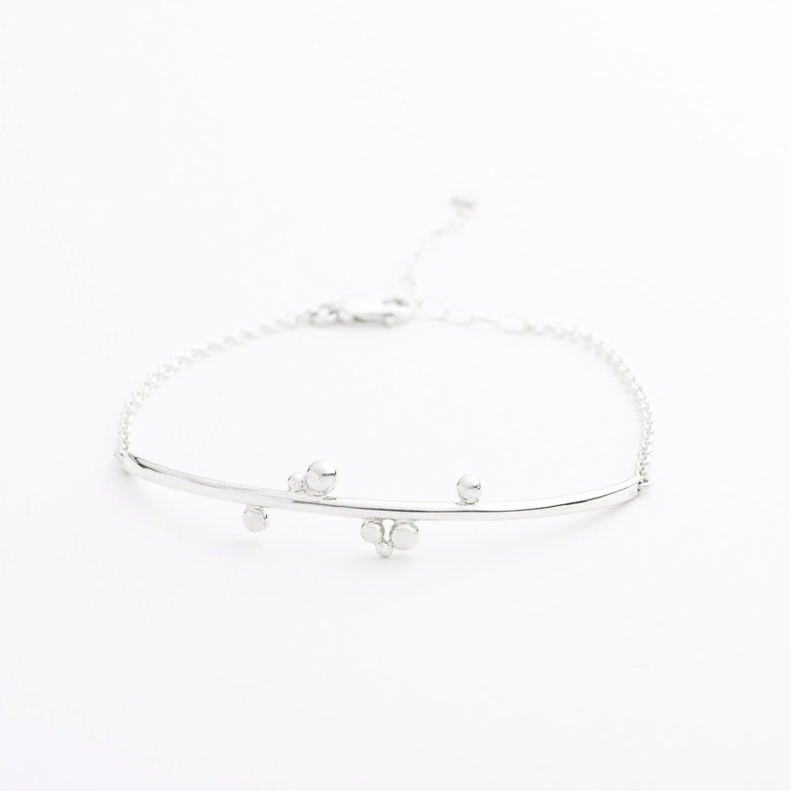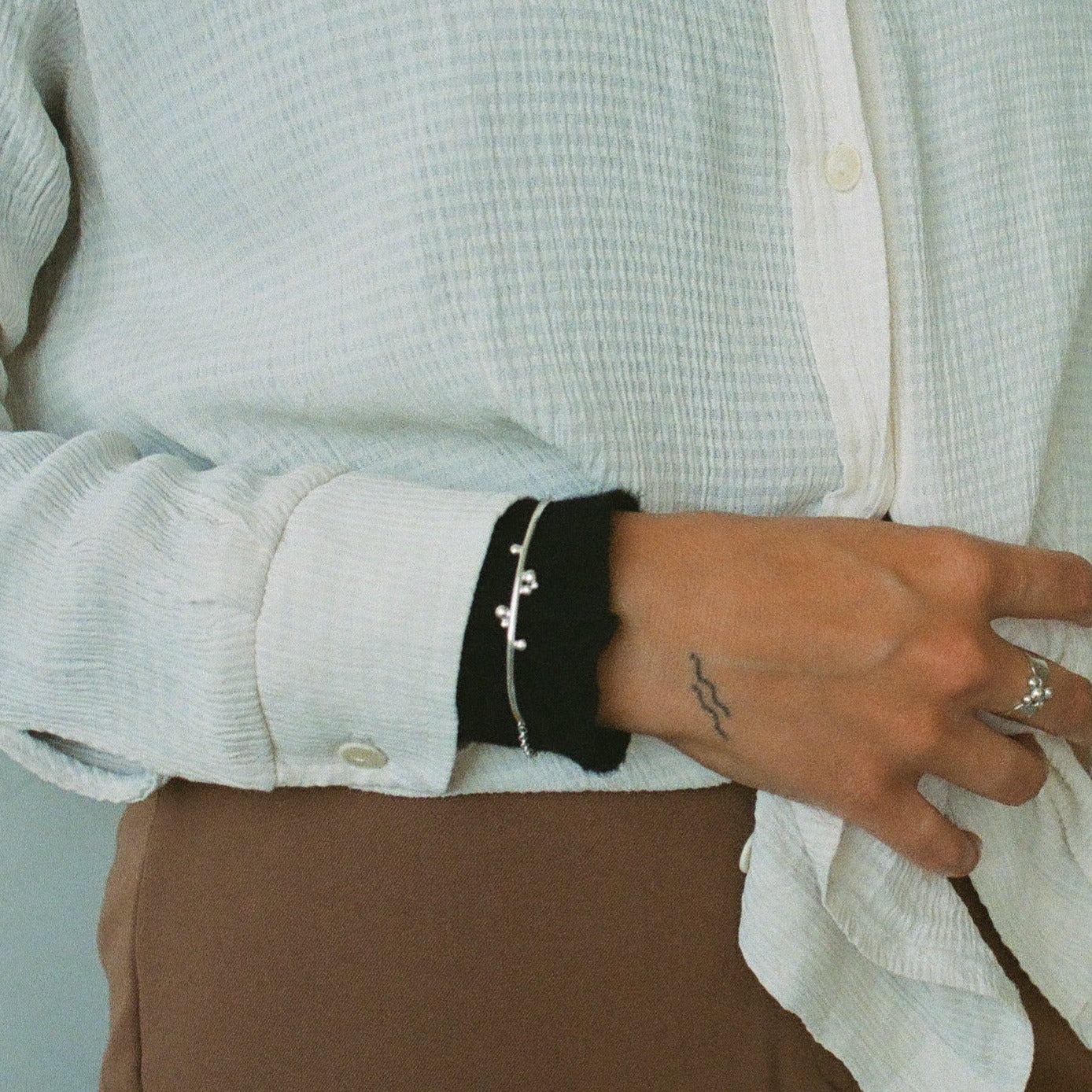 A half-rigid bracelet, in sterling silver, highlighting a semi-circle discreetly decorated with granules of recycled silver. This accessory strikes a balance between ruggedness and elegance, offering a touch of subtle sophistication to your everyday style.