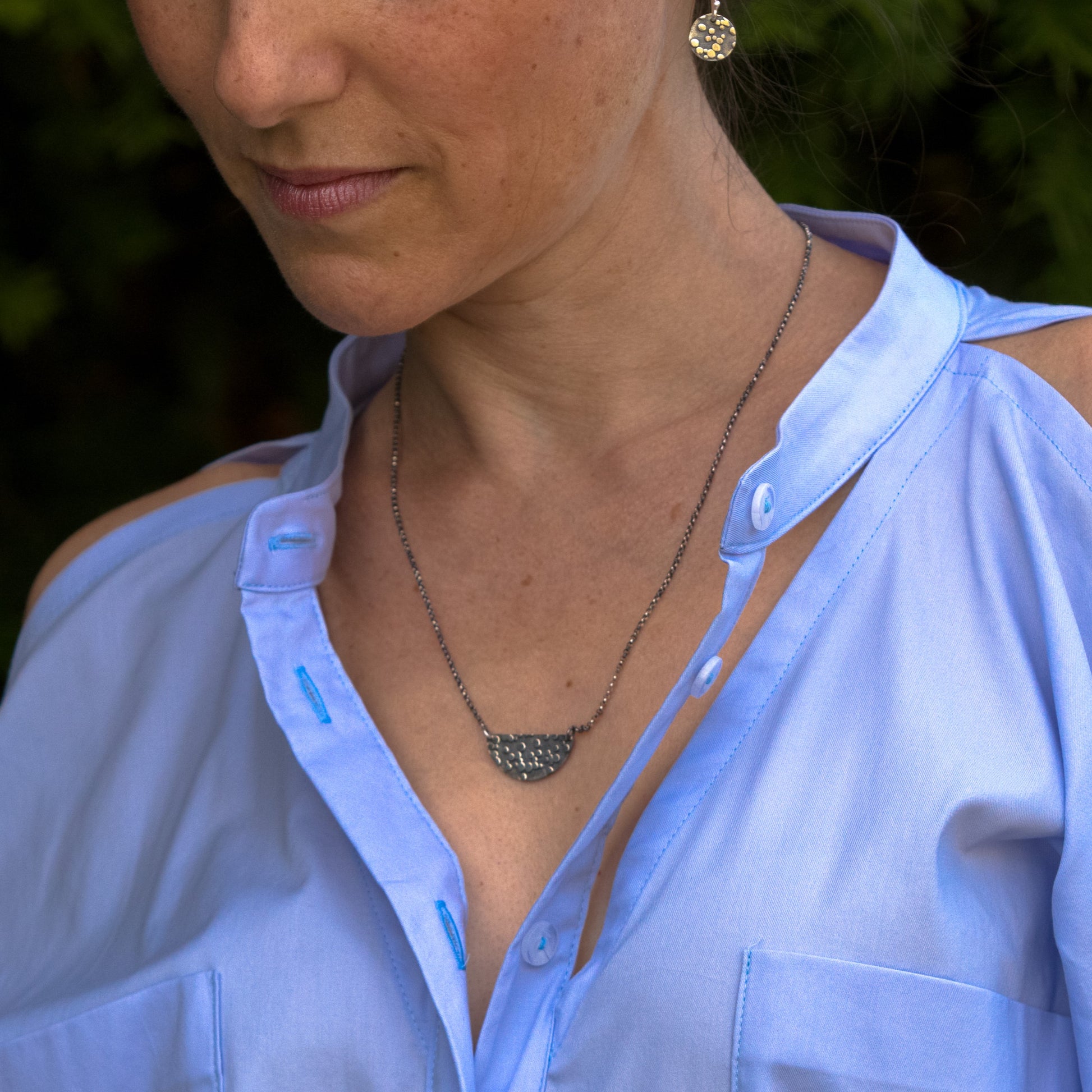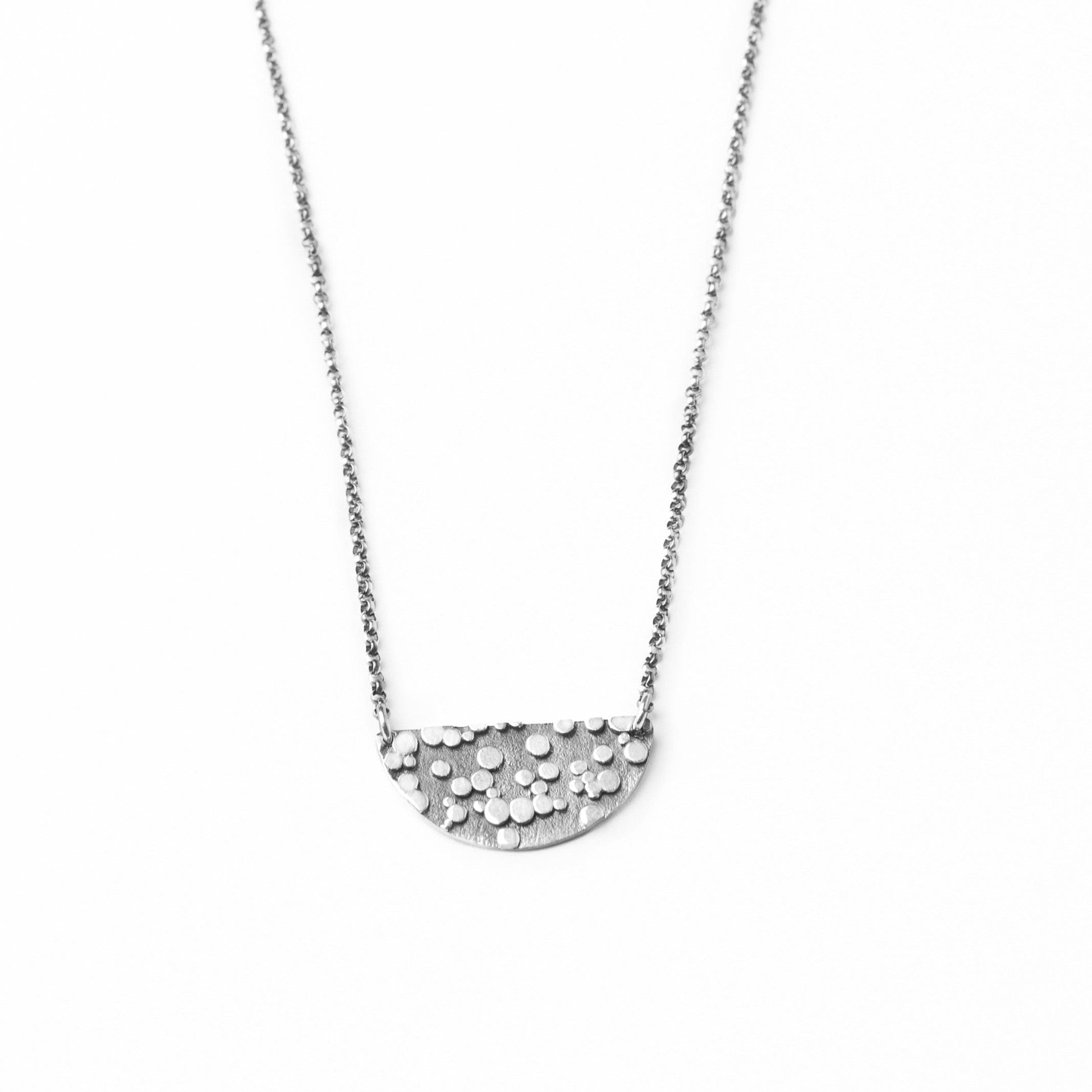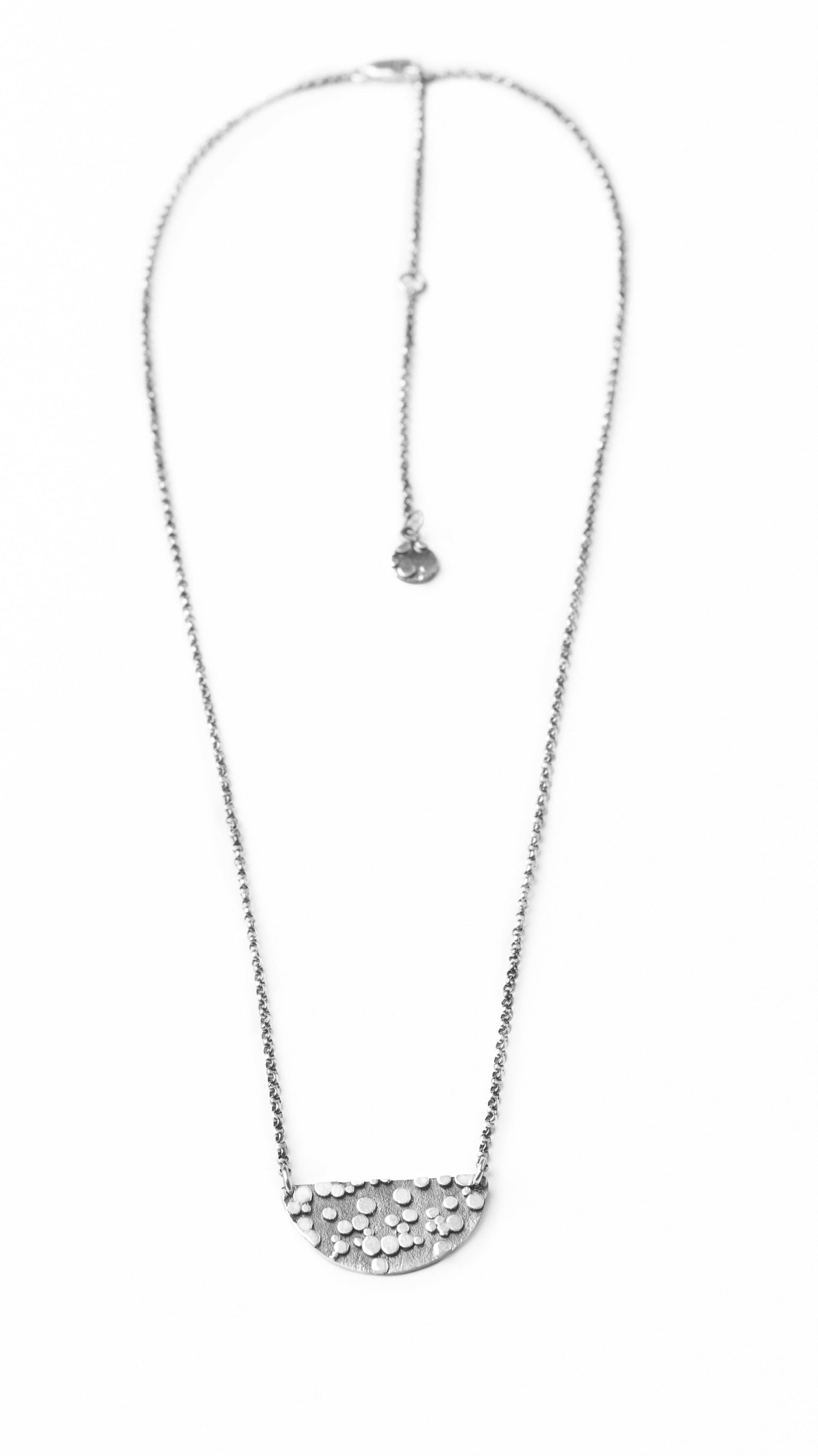 Handmade half circle necklace made for days when you want to wear something simple. The necklace features a small, signature fusion texture half circle pendant made out of sterling silver. This is a great modern, minimalist piece to wear as an everyday necklace. You can pair it with the Izar earrings and call it a day.