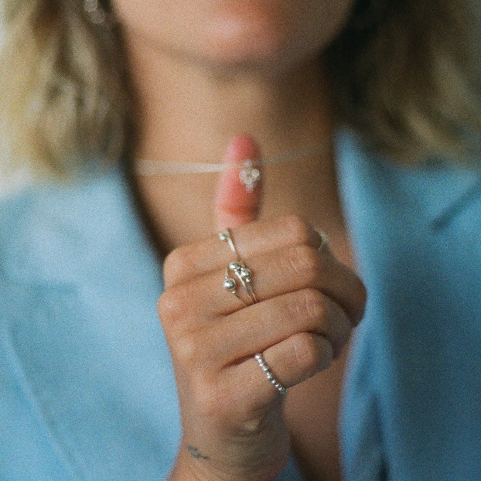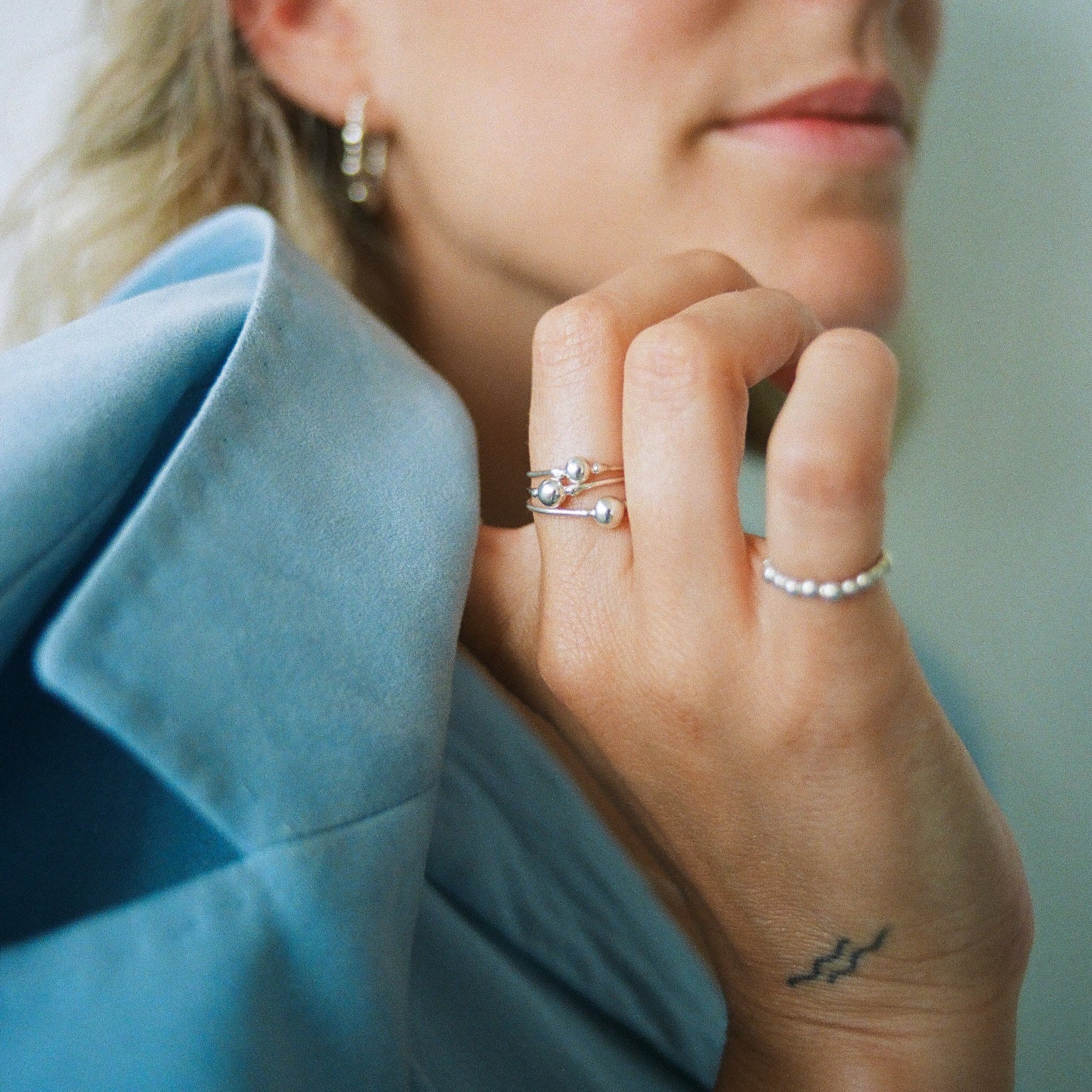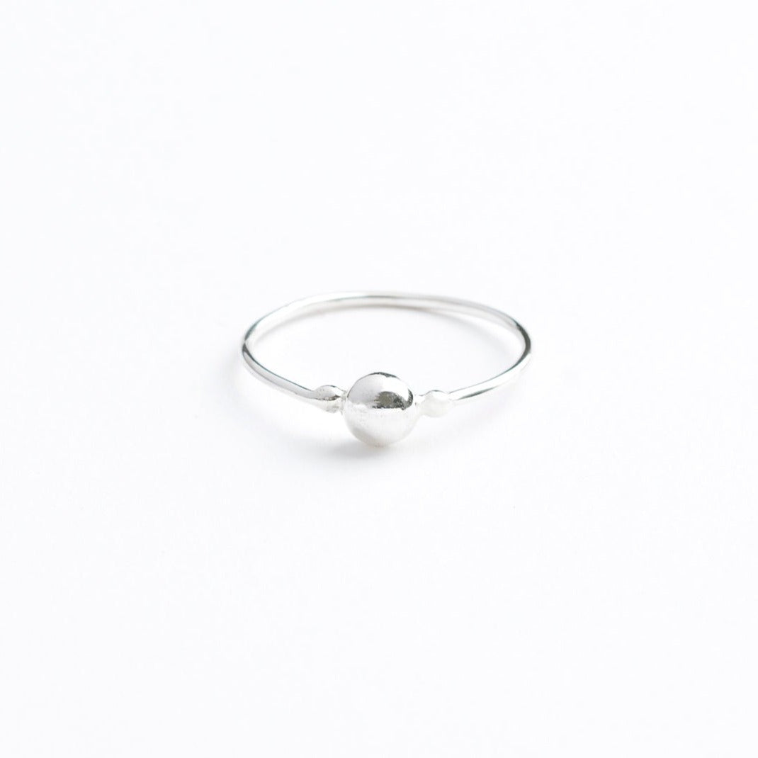 Our delicate ring is fashioned with 1.1mm round sterling silver wire. Its uniqueness lies in the brilliance of a superb large granule resulting from the fusion of metals recovered from excess production. Every meticulous detail of this unique piece embodies a precise aesthetic, offering a piece of jewelry that is both fine and remarkable.